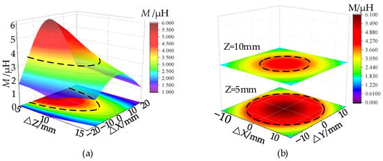 The effective power receiving region is shown within the dashed line in the figure. From the circuit simulation, the mutual inductance range of the single-transmitter and single-receiver WPT system is (3.5, 6) μH. According to Figure 10, the available space on the Z-axis ranges from Z = 5 to 12.5 mm. When the distance between the receiver coil and the transmitter coil on the Z-axis is Z = 5 mm, the effective power receiving area on the X-axis and the Y-axis is X = ±15 mm and Y = ±15 mm, respectively. When the distance between the receiver coil and the transmitter coil on the Z-axis is Z = 10 mm, the effective power receiving area on the X-axis and the Y-axis is X = ±10 mm and Y = ±10 mm, respectively.
