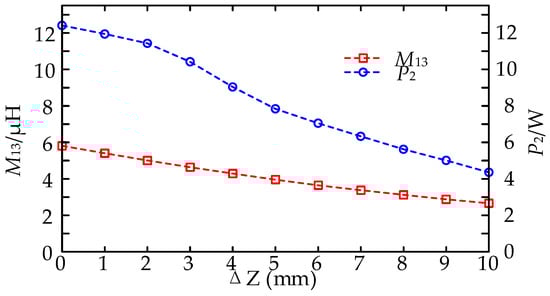Keeping the receiving coil 1 and the transmitting coil at a distance of Z1 = 5 mm, the mutual inductance and power of the receiving coil 2 are as shown in Figure 12, with the receiving coil 2 deflected in the Z-axis. The initial position of the receiving coil 2 is perfectly aligned with the receiving coil 1, and they are stacked on top of each other. Z20 = 5 mm, ΔZ denotes the misalignment distance of the receiving coil 2 on the Z-axis, and M13 denotes the mutual inductance between the receiving coil 2 and the transmitting coil.