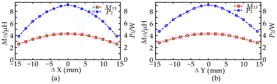 Mutual inductance and power of coil 2 at different positions of X and Y axis. (a) Coil misalignment in the X-axis. (b) Coil misalignment in the Y-axis.