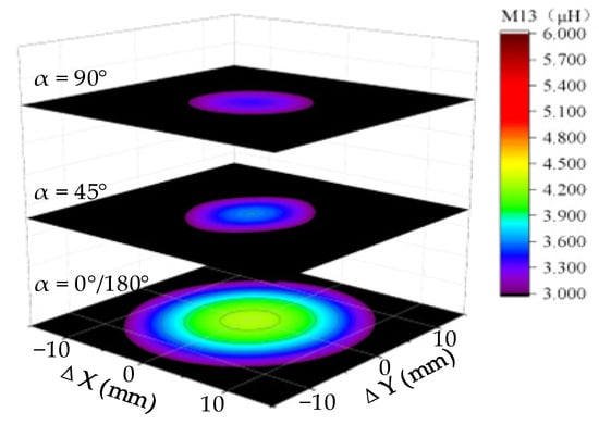 When the receiving coil 2 angle is not aligned and the X and Y-axis are misaligned at the same time, the mutual inductance is as shown in Figure 15. The colored region in the figure is the effective power receiving region. According to the mutual inductance of the receiving coil 2, when the angle is not aligned, it can be found that the effective receiving area is the largest when α = 0°. The effective receiving area is relatively small when α = 45° and α = 90°.