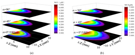 Mutual inductance of X, Z and Y, and Z-axis misalignment at different angles. (a) The coil is misaligned on the X and Z-axis at the same time. (b) The coil is misaligned on the Y and Z-axis at the same time.
