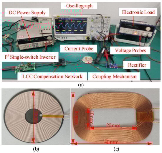 Figure 17 shows the experimental setup of the single-transmitter multiple-receiver WPT system. In Figure 17a, the debugging equipment includes a DC power supply (IT6722A), an oscilloscope (DSOX112G), a voltage probe (RIGOL RP1025D), a current probe (RIGOL RP1003C), and a DC electronic load (CH9710C). The experimental prototype includes a controller MCU (STM32F407ZGT6), a P#-type single-switch inverter (with a switch model B33N60E), an LCC compensation network, and a rectifier (SS520). Figure 17b shows the coupling mechanism. The receiver coil is 40 mm long and 30 mm wide, consisting of a rectangular air-core coil wound with Litz wire (0.2 mm wire diameter) and 15 turns. The transmitter coil has a diameter of 70 mm, wound with Litz wire (1.4 mm wire diameter) and 19 turns. Additionally, a 1 mm thick ferrite sheet is placed at the bottom of the coil to improve the coupling coefficient and shield magnetic leakage. The actual circuit parameters are consistent with those listed in Table 1.