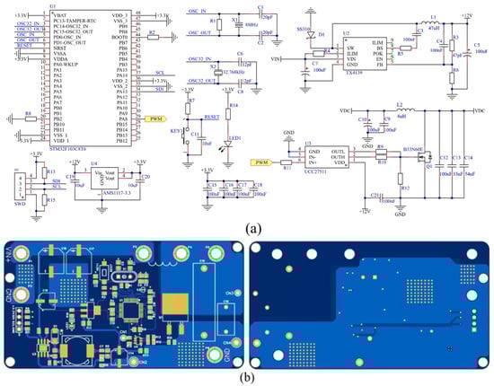 Figure 18 shows the design details of the P# single-switch inverter. The design process begins by determining the values of the resonant inductor LX and resonant capacitor CX based on Equations (1)–(3) presented earlier. During the selection of switching devices, both voltage and current stresses are considered. Typically, the voltage stress is set to four times the input voltage, while the current stress is six times the input current. Accordingly, the B33N60E is selected as the main switching device of single-switch inverter, with key typical parameters of drain-source voltage VDS of 650 V, gate-source threshold voltage VGS(th) of 10 V, on-resistance RDS(on) of 0.083 Ω, and a body diode voltage drop of 0.9 V, providing a sufficient design margin while satisfying the performance requirements. To ensure reliable switching of the B33N60E, a gate driver circuit based on the UCC27511 was designed. The schematic diagram of the P# single-transistor inverter is shown in Figure 18a, and the corresponding Printed circuit board (PCB) layout is depicted in Figure 18b.