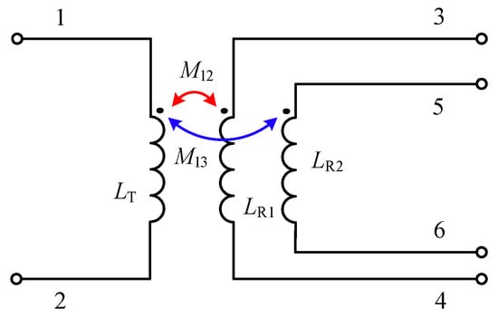 To accurately measure the mutual inductance between the transmitting coil and the two receiving coils under various positional conditions, an RLC bridge (Model: TongHui TH2840) was employed based on the simplified model of the single-transmitter dual-receiver magnetic coupling structure shown in Figure 19. First, ports 2 and 4 were connected in series, and the inductance between ports 1 and 3 was measured using the RLC bridge, denoted as L13. Next, the series connection between ports 2 and 4 was disconnected, and ports 2 and 3 were connected in series. The inductance between ports 1 and 4 was then measured and recorded as L14. The mutual inductance M12 was subsequently calculated using the following formula: