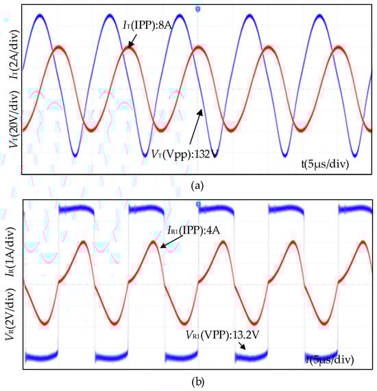 Current-voltage waveforms when the receiver coil is alignment position. (a) Current and voltage waveforms of the transmitting coil. (b) Current and voltage waveforms of the rectifier input.