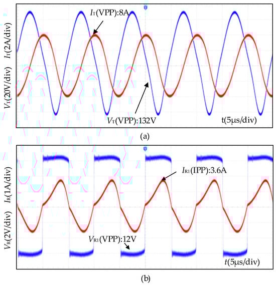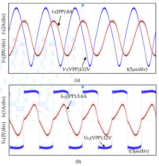 Current and voltage waveforms for the misalignment of receiving coil 2. (a) The voltage waveform of the launch coil current. (b) Rectified input current-voltage waveform of the receiving coil on the 2 side.