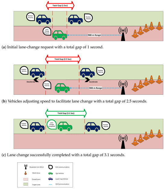 At the application level, CAVs utilize this communication model to exchange essential information such as position, speed, and road conditions. This allows vehicles to maintain situational awareness, assess time gaps, and coordinate lane changes in a cooperative manner. When a CAV receives information from the RSU about the existence of a lane closure, it evaluates real-time information from nearby CAVs to determine a safe lane-change opportunity. The decision-making process involves analyzing time gaps between leading and lagging vehicles in the target lane to ensure smooth and predictable maneuvers, with a total accepted gap of at least 3 s based on typical lead and lag gap thresholds reported in [53].