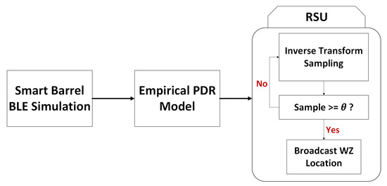 Building on this empirical modeling approach, the RSU processes incoming barrel data using a threshold-based transmission mechanism. Thresholds () of 0.70, 0.85, 0.90 were applied to determine whether a message should be broadcast. These decisions are informed by sampling from the previously derived PDR distribution, with transmissions occurring only when the sampled values exceed the selected threshold. This mechanism is described in more detail in the subsequent sections.