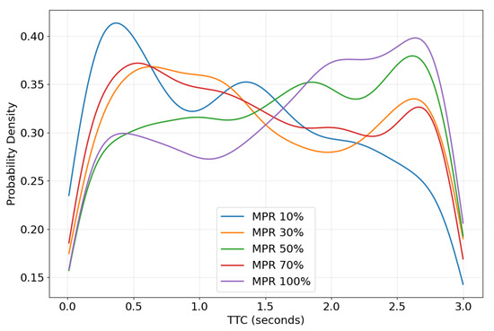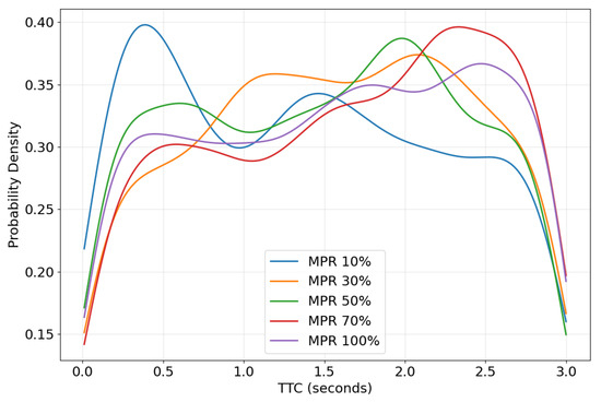 As MPR increases to the medium range (40–60%), packet loss begins to rise, particularly for the 70% threshold. Despite this, safety metrics in the distributions continued to improve, suggesting that the system remains resilient. Even with moderate packet loss, successful communications are frequent enough to uphold safety benefits. In the high MPR range (70–100%), packet loss increases sharply across all thresholds. However, distributions still showed the best safety performance in this range, highlighting that despite higher packet loss, the increased number of connected vehicles ensures that successful message transmissions occur frequently enough to maintain safety benefits. Comparing thresholds, the 70% threshold exhibits an earlier onset of packet loss but a more gradual rise, whereas the 85% and 95% thresholds show steeper increases at high MPRs. Nevertheless, all thresholds maintained safety advantages, reinforcing the system’s robustness. The results indicate that while higher MPRs introduce network congestion challenges, the trade-off between communication performance and safety outcomes remains manageable.