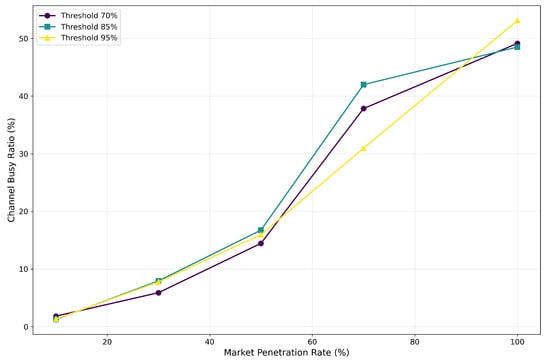 The merge success rate and analysis further validate the system’s effectiveness across varying deployment scenarios. Merge success rates consistently exceed 90% across all configurations, with the 85% threshold demonstrating optimal performance at lower MPRs (perfect 100% success rates at 10–50% MPR). This indicates that a mid-range threshold provides an ideal balance for early deployments. The analysis reveals that at low penetration rates (10–30%), all thresholds maintain minimal channel occupation (1–8%), enabling reliable communications. As the MPR increases, the 95% threshold demonstrates superior congestion management at moderate penetration rates, maintaining lower channel utilization (31% at 70% MPR) compared to other thresholds. However, at full market penetration (100%), all thresholds converge to similar values (49–53%), suggesting that in dense deployment scenarios, additional congestion control mechanisms may become necessary regardless of threshold selection. These findings support a phased deployment approach, beginning with lower thresholds (70–85%) in early stages when MPR is low, then transitioning to higher thresholds (95%) as connectivity increases, eventually incorporating dedicated congestion control mechanisms for widespread deployment.