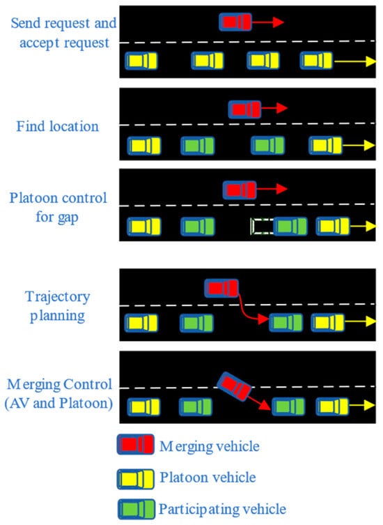 As shown in Figure 1, the merging process into a platoon consists of three sub-problems: (1) platoon longitudinal control, (2) single-vehicle trajectory planning and (3) single-vehicle control. Finding the location of a platoon gap is neglected in this paper, because the issue is relatively simple; existing methods use the proximity principle [1] and the core technical challenges reside in the subsequent phases. The first sub-problem addresses the maintenance of inter-vehicle spacing within the platoon, while the second sub-problem involves synthesizing trajectory planning and lateral–longitudinal control for safe merging maneuvers. Currently, researchers have explored classical control, optimal control, and learning-based methods for platoon and single-vehicle control tasks.