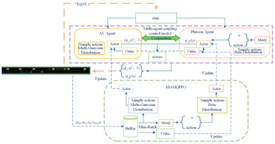 As the time steps progress, once the collected data reaches the length set by the experience replay pool, each piece of data contains rt, which includes rAV, rplat, and renergy. During training, the AV Agent and Platoon Agent select the corresponding reward functions. We then select the specified mini-batch data from the pool for training and update the parameters of the MQMAPPO algorithm. These parameters are subsequently copied to the Actor–Critic network of the multi-agent control model to continue collecting data for the next round.