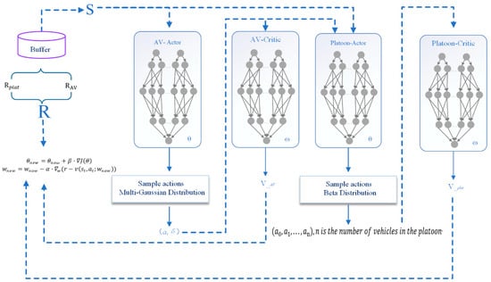 As shown in Figure 3, the multi-agent deep reinforcement learning model in this paper uses Actor–Critic networks and control techniques, enabling efficient control of AVs and platoons. The model consists of an AV Agent and a Platoon Agent. The input dimension of the Platoon Agent depends on the platoon size (n).