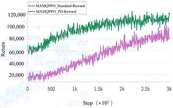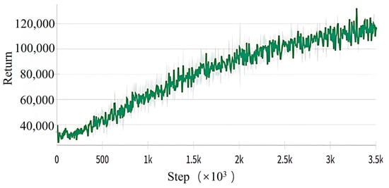 The energy consumption reward function is based on the vehicle dynamics model, as detailed in the literature [23], which describes the energy consumption formula, and the parameter values of the formula, with the main unit being watts per second . The negative value of its energy consumption is utilized as a reward–penalty term to promote the vehicle to reduce the energy consumption of the platoon by learning to perform higher rewarding.