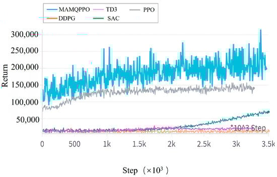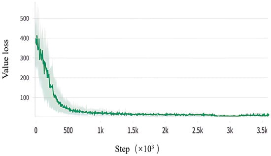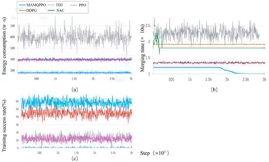 At the start of the experiment, the initial states of AV, platoon, and environmental vehicles were detailed in Attachment 2. According to the literature [28], traffic flow states can be classified based on vehicle spacing thresholds: free flow (≥40 m), synchronized flow (20–40 m), and congested flow (≤20 m). To enhance algorithm generalization, we used three sets of random seeds to simulate free (10 vehicles, vehicle spacing = 100 m), synchronized (30 vehicles, vehicle spacing = 33.3 m), and congested (50 vehicles, vehicle spacing = 20 m) traffic flow conditions. Experimental results, as shown in Figure 5, Figure 6, Figure 7 and Figure 8, display reward return, value loss, merging time, energy consumption, success rate, average headway distance, and average speed after merging.