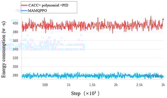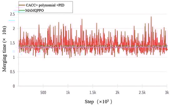 Based on the information from Figure 11 and Figure 12, Table 4, the following detailed experimental results were obtained: Both models successfully completed the task of the AV merging into a platoon. The MAMQPPO method demonstrated significant advantages over the polynomial planning and PID control model in terms of energy consumption, achieving reductions of 58%. Additionally, in the key indicator of merging efficiency, the MAMQPPO method also showed a 37.69% increase compared to the polynomial planning and PID control model. Therefore, MAMQPPO is a more effective solution for AVs merging into platoons compared to traditional control models.