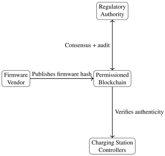 Decentralized mechanisms seek to mitigate these single points of failure by distributing trust across multiple entities. Permissioned blockchain networks, for instance, can involve various stakeholders such as OEMs, energy providers, regulatory bodies, and station operators in consensus-based decisions [27]. When each stakeholder validates the authenticity of a firmware package, the overall trust in that package is strengthened. Smart contracts further enhance this model by automating checks for firmware version control, scheduling, and compliance with operational policies [28,29]. In addition, zero-knowledge proofs and advanced encryption standards can be integrated to obfuscate sensitive details while still allowing for verifiable attestations [30].