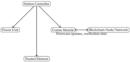 Modern charging stations include multiple modules, such as a power electronics unit, a payment interface, and a communication controller. These modules require periodic firmware updates to incorporate new features or security patches. In the proposed framework, a local controller in each charging station maintains a secure element (e.g., a trusted platform module) that stores cryptographic keys used for validating firmware signatures. Figure 2 demonstrates a simplified architecture of a charging station with connectivity to the blockchain network for firmware updates.