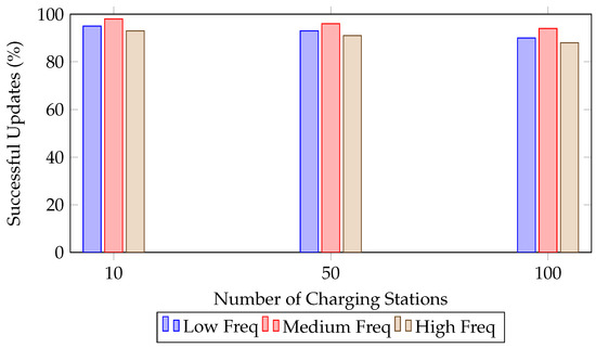 Figure 3 illustrates the success rate of firmware updates across varying network scales. At 100 charging stations, the framework maintains success rates above 88% for high-frequency updates, demonstrating robust scalability. For larger deployments, simulations with 1000 vehicles reveal an average throughput of 15 transactions per second (TPS). This aligns with industry standards for IoT systems, where 10–20 TPS is considered sufficient for real-time operations in distributed networks [38]. Latency increases by only 35% compared to the 50-vehicle scenario, a manageable trade-off given the enhanced security guarantees.