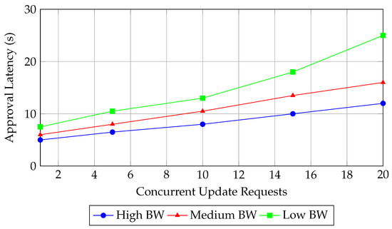 Figure 4 highlights the framework’s performance under constrained bandwidth. Even with 20 concurrent requests in low-bandwidth conditions, approval latency remains below 30 s. This meets the real-time requirements of EV charging stations, where firmware updates often involve critical security patches that cannot tolerate prolonged delays [43].