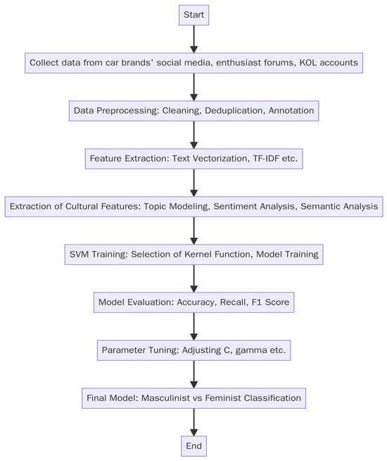 To address these limitations and gain a deeper understanding of how cultural dimensions influence customer expectations of service quality, this study employs a novel approach using the Support Vector Machine (SVM) algorithm. The SVM algorithm, rooted in statistical learning theory, represents a sophisticated supervised learning methodology. The algorithm extracts a set of characteristic subsets from the training samples, ensuring that the classification of these subsets corresponds to the segmentation of the entire dataset. Extensive empirical evidence across diverse application domains substantiates the SVM’s robust efficacy in resolving a wide array of complex classification tasks [62,63]. This classification is based on the extraction of cultural features from the data, providing a direct assessment of cultural values as expressed by individuals in a natural setting. The flowchart for cultural feature extraction and classification based on the SVM algorithm is shown in Figure 1.