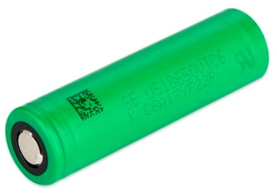 The batteries used in this study were cylindrical VTC6 18650-type lithium-ion cells (LiBs) with a capacity of 3 Ah, manufactured by Sony in China (Figure 1). These cells feature a Li(NiMnCo)1/3O2 cathode and a graphite anode, with an average mass recorded at 46.6 g. Their nominal capacity and voltage were 3 Ah and 3.7 V, respectively. In this paper, the C-rate (C) is defined as 1C = 3 A.