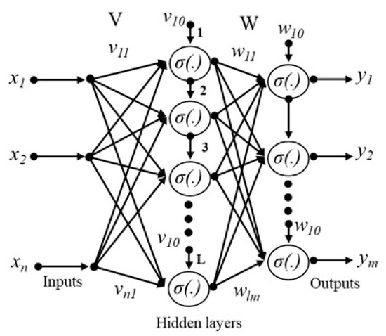 Artificial Neural Networks (ANNs) have demonstrated high accuracy in battery estimation tasks [30,31,32,33,34]. Among these, feed-forward neural networks (FNNs) stand out as a particularly effective approach for dynamic systems, making them suitable for modeling battery degradation. FNNs excel in predicting a single output, such as capacity degradation, which aligns with the requirements of this study. Therefore, a feed-forward neural network architecture was employed to build the lifetime model. Figure 4 illustrates a typical two-layer FNN configuration, with the corresponding mathematical expressions presented below [38]: