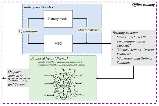 Conceptually, a neural network (NN) is integrated with an MPC, where the input and output data generated by the MPC serve as the training set for the ANN-MPC. Typically, the neural network is trained offline using the data samples collected from the MPC’s operation. The measurement data produced by the MPC are stored in tables, and to ensure thorough data coverage, a comprehensive training dataset is gathered. Once trained, the ANN-MPC can operate independently, using straightforward mathematical functions to compute complex simulations and optimization algorithms efficiently.