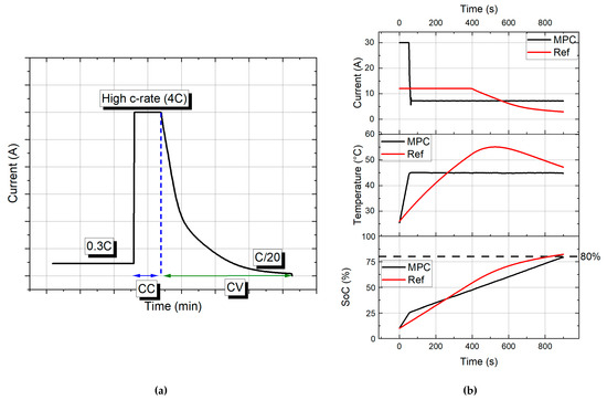 (a) Fast-charging profile of the case study. (b) MPC comparison results of the high-current phase in [37] with the current, temperature, and SoC compared to the experimental data.