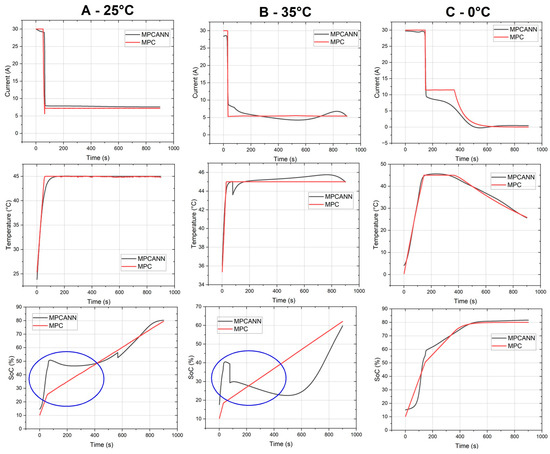 The MPCANN current, temperature, and SoC results were compared with the MPC at 25 °C (A), 35 °C (B), and 0 °C (C).