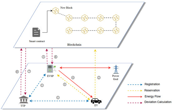EVs: Register with the TTP in the first step and initiate a charging reservation application, then upload the charging reservation information to the blockchain and send it to the EVSPs in steps 2 and 3.