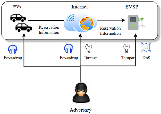 Eavesdropping attack: Malicious attackers intercept communications between EVs and EVSPs to capture unencrypted reservation data. This attack is particularly insidious because it does not alter the communication process, making detection difficult. Intercepted data can reveal sensitive information, such as EV users’ charging behaviors, energy requirements, and locations. Such data can be exploited to track user movements, for identity theft, or for targeted fraud, posing serious privacy risks to EV users.