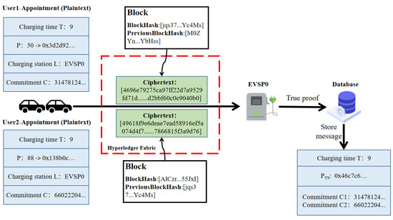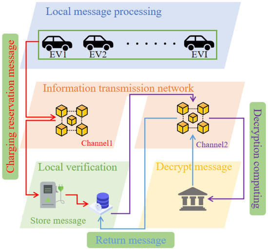 In the Hyperledger Fabric consortium blockchain, the two channels are divided as illustrated in Figure 3. Channel1 is designated for EV charging reservations, whereas channel2 is allocated for EVSP ciphertext aggregation and audit application. Through this design, the EVSP is incapable of accessing the reservation plaintext information of individual electric vehicles, and the TTP remains uninformed of the origin of specific reservation information. The EV’s charging reservation information exclusively utilizes the RSA asymmetric encryption algorithm, safeguarding crucial data throughout the entire process. Notably, the reservation details, such as the identity verification evidence π, reserved time T, charging amount P, charging location L, and commitment C, are encrypted with the public key of the EVSP corresponding to the reserved charging location.