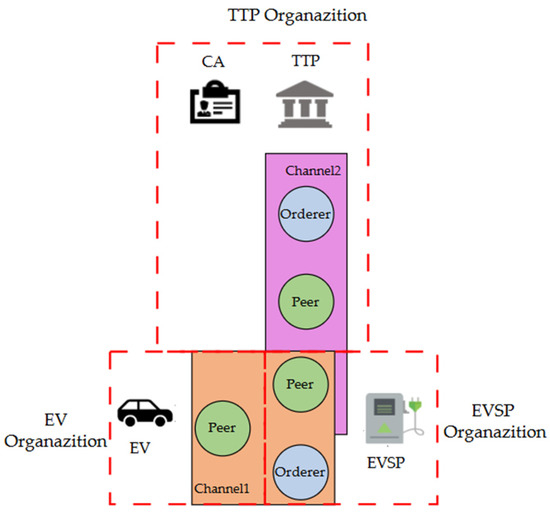 There are three core organizations in this model. Channel1 includes the EV organization and the EVSP organization, with each deploying a single peer node. The orderer node in this channel is exclusively managed by the EVSP organization to ensure transaction orchestration. Channel2 establishes collaboration between the EVSPs and the TTP organization, where the TTP holds administrative control over the orderer node while operating a dedicated peer node to facilitate communication with EVSPs. A certificate authority (CA) managed by the TTP governs identity authentication and authorization processes for all entities joining the consortium blockchain. The orderer nodes execute critical functions of transaction ordering and block generation, while all peer nodes simultaneously act as committing nodes (maintaining the distributed ledger) and endorsing nodes (validating transactions through smart contract execution). The detailed network architecture is depicted in Figure 4.