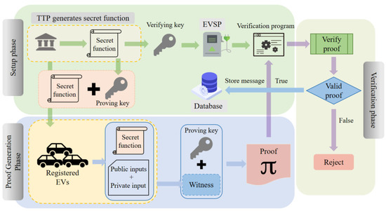 Setup phase: The secret function is utilized by the TTP to configure the zero-knowledge proof program along with the common parameters that are shared with both of the registered electric vehicles. Following this configuration, the proof key and verification key are generated by the TTP, which are then transmitted to the EVSPs and registered electric vehicles. Subsequently, the EVSPs develop a zero-knowledge proof verification program leveraging the secret function, its corresponding parameters, and the verification key.