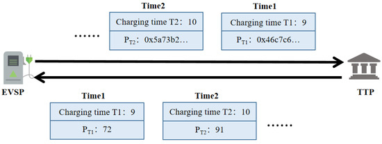 The Paillier homomorphic encryption algorithm used in these processes possesses additive homomorphic properties, enabling the aggregation of reserved charging amounts and the computation of charging deviation quantities without revealing the specific values for individual electric vehicles. Notably, this approach maintains zero-knowledge characteristics, allowing a TTP to aggregate the reserved charging amounts and calculate the charging deviation quantities without accessing the specific values. Due to the nature of homomorphic encryption, decryption is not required even when the reserved charging amounts and charging deviation quantities need to be processed by the TTP. This feature enhances the security by ensuring that even if the data are analyzed or manipulated by an external entity, the original information remains confidential. By granting the EVSP sole access to the homomorphic decryption key, the process guarantees that neither the trusted third party nor the provider can gain access to the reservation details of any single electric vehicle, thereby safeguarding the users’ privacy and data integrity (Figure 10).