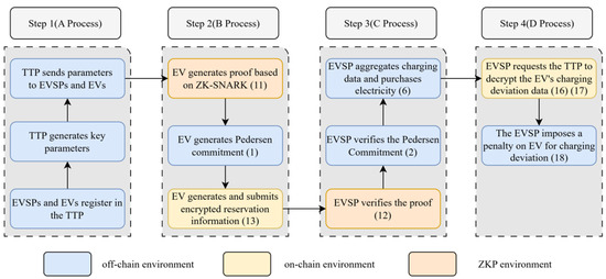 As the global concerns regarding energy sustainability and environmental conservation escalate, electric vehicles (EVs) have emerged as a prominent solution owing to their green and eco-friendly attributes [1,2,3]. However, the operational dependency of EVs on frequent charging sessions has accentuated privacy apprehensions, particularly regarding the issues of charging reservations and subsequent deviation settlements for EV charging service providers. The iterative communication between EVs and charging service providers engenders the risk of data exposure encompassing personal details, location information, driving patterns, and charging behaviors [4,5,6]. Consequently, amidst the progressive evolution of EV technology and the burgeoning user base, safeguarding the privacy of EV charging operations assumes critical significance [7].