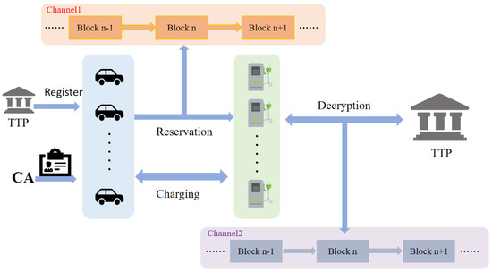 In this paper, the electric vehicle charging privacy protection model under study primarily employs the Hyperledger Fabric consortium blockchain [23] as the medium for information transmission. The model is structured into two distinct channels. Channel1 serves the electric vehicle charging reservation applications, while channel2 caters to the EVSP requesting the TTP decryption operations (Figure 3). This multi-channel design enforces role-based access control, with explicit separation of management authority between EVSPs (channel1) and the TTP (channel2), ensuring both the privacy of EV charging information and cross-organizational trust.