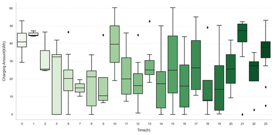 The EV charging data presented in this study were sourced from charging stations located in northern China. Figure 12 illustrates the hourly distribution of this charging data, with the box plot showing medians, interquartile ranges, and outliers to represent its characteristics. Additionally, the day-ahead and real-time market price data used in this study were sourced from the PJM electricity market in the United States [24], corresponding to a specific day in the summer of 2024.