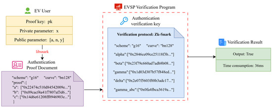Figure 13 illustrates the identity authentication process of the EVs based on zero-knowledge proof. In this process, the non-interactive zero-knowledge proof library libsnark is used, with the Groth16 algorithm and the BN128 elliptic curve selected. The primary objective of this process is for the EV to demonstrate knowledge of a valid private parameter x that satisfies specific conditions, thereby proving its status as a legitimately registered user without revealing the parameter itself. The elements “a”, “b”, and “c” represent the three components of the zero-knowledge proof generated by the electric vehicle user using the proof parameters. The corresponding verification key (as shown in the middle part of the figure), obtained by the EVSP from the TTP, is used to verify the proof. The right part of the figure shows the verification result and time overhead of the EVSP. The charging reservation information will only be processed further if the verification is successful.