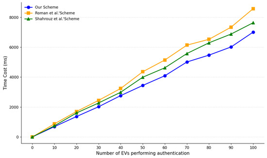 Figure 14 illustrates the time costs of various authentication schemes as the number of EVs increases from 0 to 100. This study compared the performance of our proposed scheme with those of Roman et al. [25] and Shahrouz et al. [15]. In the tested scenario, our scheme constantly displayed the lowest calculating cost. For instance, with 10 EVs, our scheme incurs a computational cost of 689 ms, compared to 874 ms for the Roman et al. scheme and 742 ms for the Shahrouz et al. scheme. As the number of EVs increases, our scheme sustains its efficiency advantage, achieving a computational cost of 7009 ms with 100 EVs. This performance is notably superior to the 8576 ms recorded for Roman et al.’s scheme and the 7635 ms for Shahrouz et al.’s scheme under identical conditions. These results highlight that our scheme delivers improved scalability and better performance, even as the authentication demands gradually intensify.
