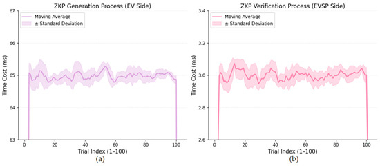 Figure 15a illustrates the time cost of the proof-of-identity generation process over 100 trials. We present the time cost as a smoothed curve—calculated with a sliding window size of 5 (i.e., a moving average calculated by averaging the current trial with its two preceding and two subsequent trials)—with an overlaid ± standard deviation band to highlight the overall trend and variability. The results indicate that the generation time hovers around 65 ms, remaining within a narrow fluctuation range (approximately from 64.451 ms to 65.543 ms) and averaging 65.134 ms. This stable performance underscores the scheme’s robustness and efficiency, enabling identity generation with low overheads.
