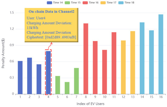 Figure 16 illustrates the penalty results for all non-compliant charging EV users during the 14:00–18:00 period. The charging amount deviation is derived by the EVSP through a homomorphic decryption request to the TTP via channel2 and is subsequently stored on the blockchain of channel2, ensuring that the data remain tamper-proof and immutable. Furthermore, the penalty amounts are calculated by the EVSP based on the charging amount deviations recorded on the blockchain of the EV users and the penalty price for the corresponding time period, ensuring the reliability and credibility of the penalty results.
