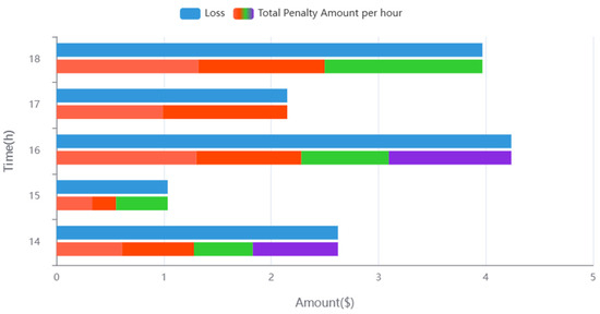 Figure 17 illustrates the losses incurred by EVSP0 in the real-time market, resulting from the need to buy or sell the exact amount of electricity at real-time prices due to deviations from the aggregated reserved charging amounts, as well as the total penalty amounts imposed on EV users during the 14:00–18:00 period. The total penalty amount per hour represents the cumulative penalties imposed on all non-compliant charging EV users within that hour. In the figure, each colored segment within the bars representing the total penalty amounts per hour corresponds to the penalty imposed on an individual non-compliant charging EV user during that hour. From the figure, it can be observed that for each hour, the total penalty amount corresponds to the loss incurred by EVSP0 during the same hour. This suggests that the charging deviation settlement mechanism is effective in safeguarding the economic interests of the EVSP.