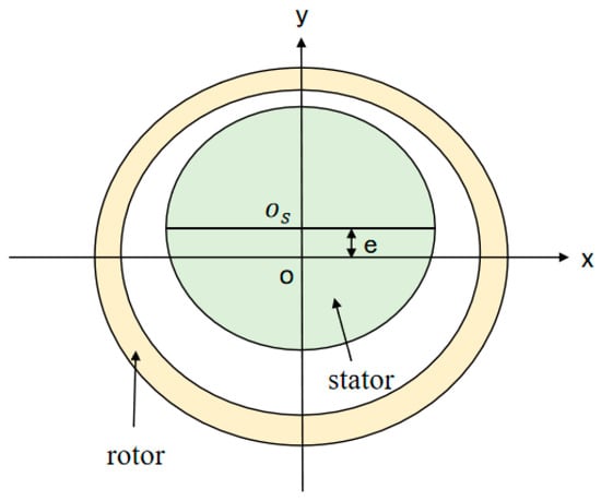 Assume that the stator is eccentric with the eccentricity of e in the positive direction of the Y-axis, as shown in Figure 2, and o and are the rotation centers of the stator and rotor, respectively. In order to accurately analyze the influence caused by eccentricity, many studies transform the air gap magnetic field model without eccentricity into the motor air gap magnetic field model with eccentricity by introducing the permeability correction coefficient [30].
