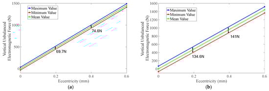 Variation in unbalanced electromagnetic force with eccentricity. (a) Phase 20 A current amplitude. (b) Phase 40 A current amplitude.