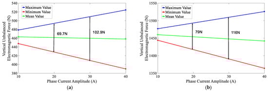 Variation in unbalanced electromagnetic force with phase current amplitude. (a) 0.2 mm eccentricity. (b) 0.6 mm eccentricity.