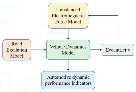 As shown in Figure 8, the vehicle dynamics model outputs eccentricity under the excitation of the road surface. The unbalanced electromagnetic force module calculates the unbalanced electromagnetic force based on the output eccentricity and outputs the force to the vehicle dynamics model, further exacerbating the eccentricity. At the same time, it also outputs other vehicle dynamics performance indicators (sprung and unsprung mass acceleration, suspension dynamic deflection, tire dynamic load, etc.). Thus, a coupling between the unbalanced electromagnetic force and the vehicle dynamics model is formed.
