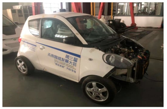 Due to technical limitations, wheel hub direct-drive electric vehicles have not yet entered the mass production stage. Therefore, a mini-car developed by the School of Automotive Engineering of our university is taken as the research object, as shown in Figure 9. Assuming that all structural parameters in the model are linear and the body as a whole is rigid, a vertical dynamics model of a half-car is established without considering load transfer. Its structure is shown in Figure 10, and Table 3 is the parameter table of the vertical dynamics model of a semi-car.