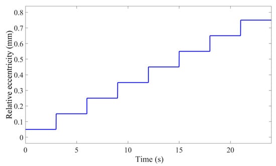 Figure 3 shows the variation in the vertical unbalanced electromagnetic force with eccentricity for the current amplitudes of 20 A and 40 A at 390 rpm at a uniform speed. It can be found that under the input current amplitude of phase 20 A, the amplitude of the vertical unbalanced electromagnetic force increases sharply with the increase in the eccentricity of the fixed rotor. When the eccentricity increases from 0 mm to 0.6 mm, the peak value of the vertical unbalanced electromagnetic force increases by nearly 1500 N; however, when the eccentricity increases from 0.3 mm to 0.4 mm, the amplitude of the vertical unbalanced electromagnetic force increases sharply. The fluctuation range of the vertical unbalanced electromagnetic force, that is, the difference between the maximum value and the minimum value, increased from 69.7 N to 74.6 N, an increase of only 4.9 N. Similar simulation results are obtained with 40 A phase current amplitude input.